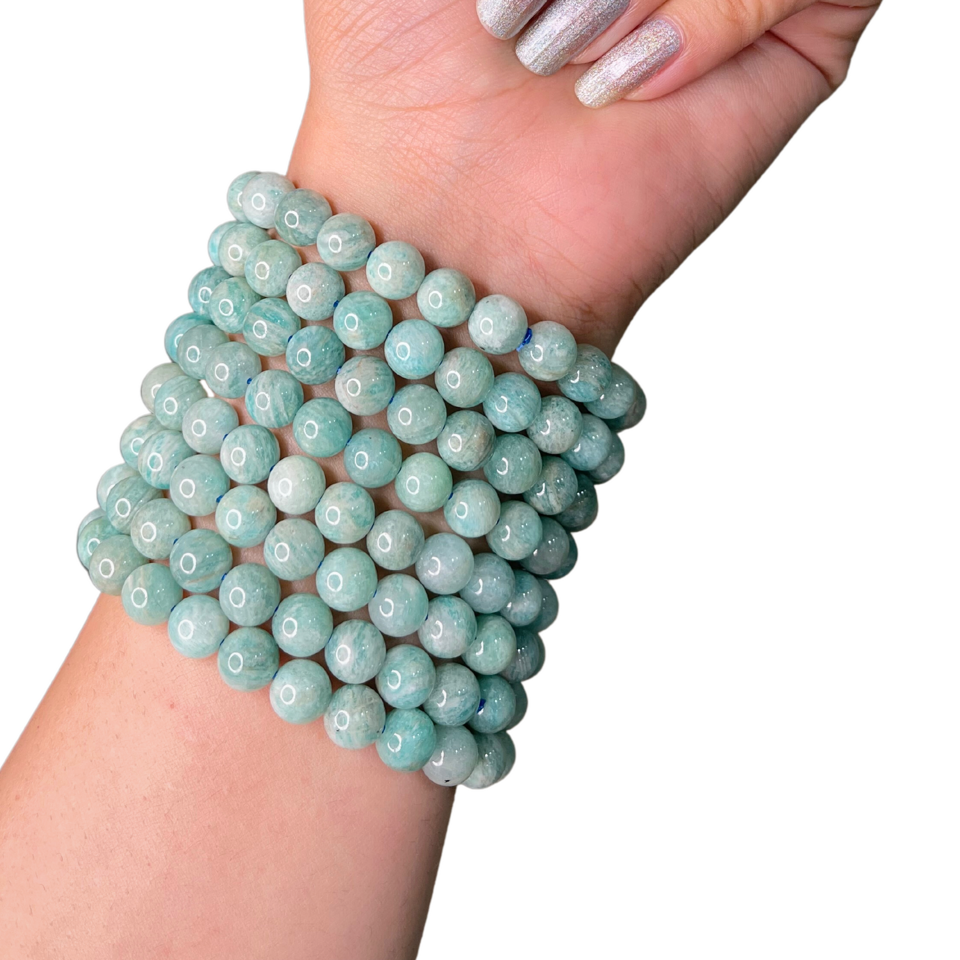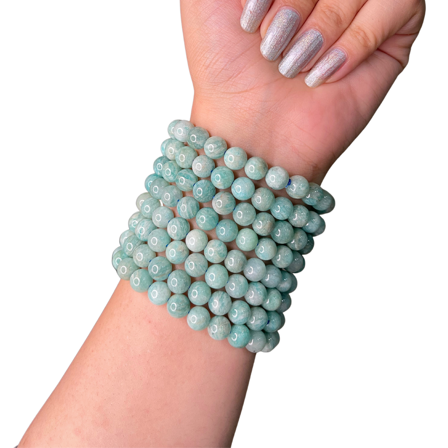 The Amazonite Bead Bracelet features 8mm amazonite beads with silver plated accents. The bracelet is adjustable to fit almost any wrist size and is designed to last a long time. The natural color of the amazonite beads is unique in each bracelet, giving it an exclusive style. Enjoy the simple luxury of a timeless look with this bracelet.