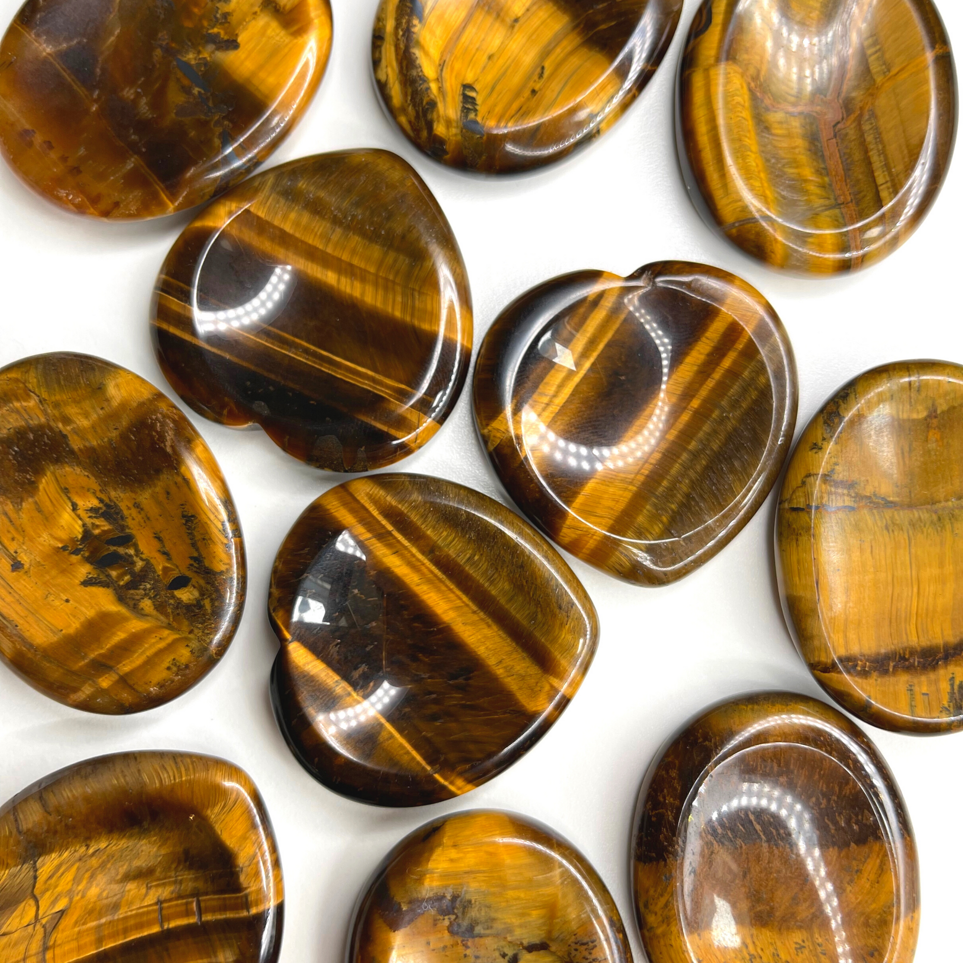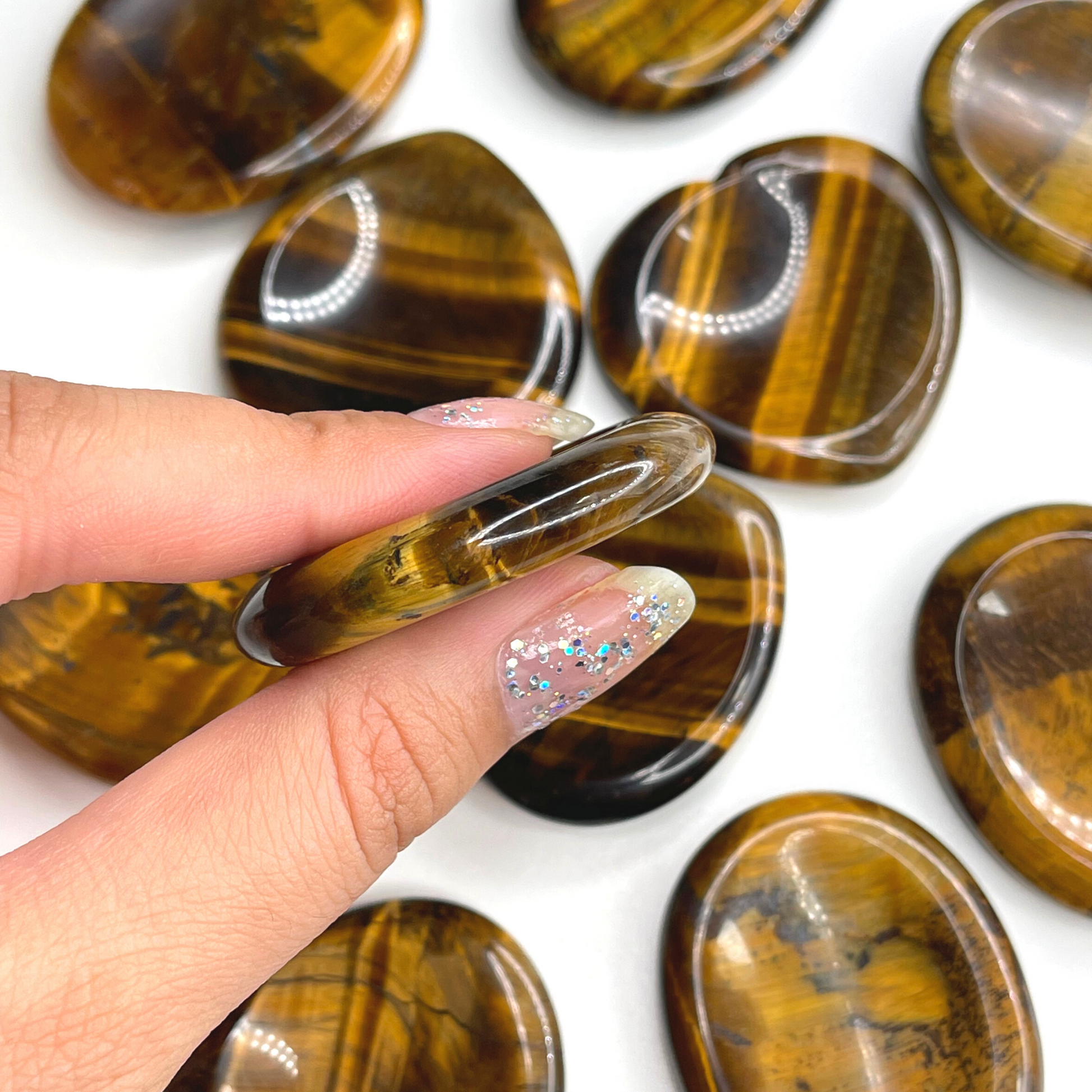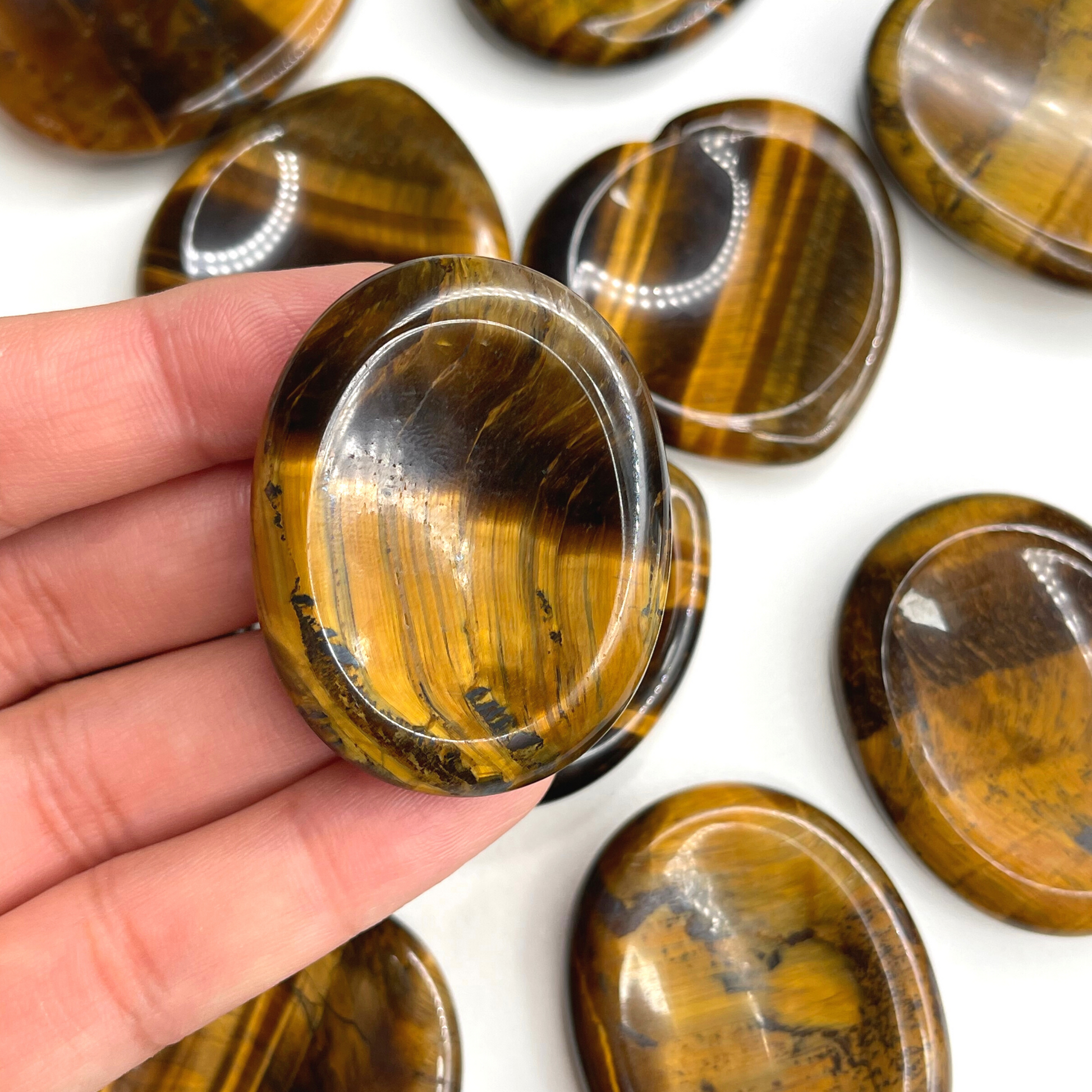 Tiger Eye worry stone (also know as thumb stone), is used to relieve anxiety and stress. This is a stone used by monks to distract mind from any stress and meditate. You rub the worry stone with your thumb, fingers or in your palms and can stimulate different nerve endings that promote calmness, release endorphins, and have an overall euphoric effect.