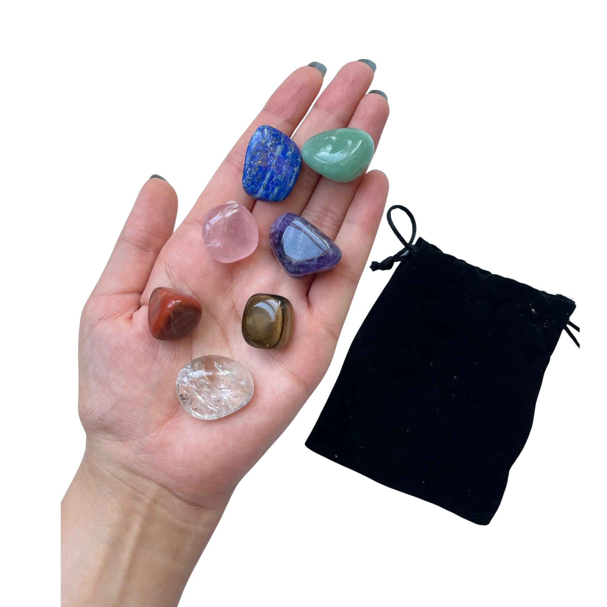 Chakra Bag includes 7 different gemstone tumbles and used for reiki healing. Each stone is meant to help with a specific chakra.