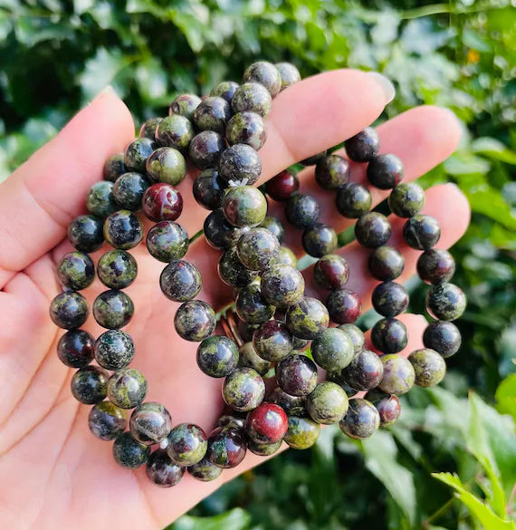 The Dragon Bloodstone Bracelet is a 8mm bead, striking and powerful accessory, handcrafted with genuine dragon bloodstone gems. This rare stone is known for its ability to bring balance, strength, and vitality to the wearer. Elevate your style and energy with this unique bracelet.