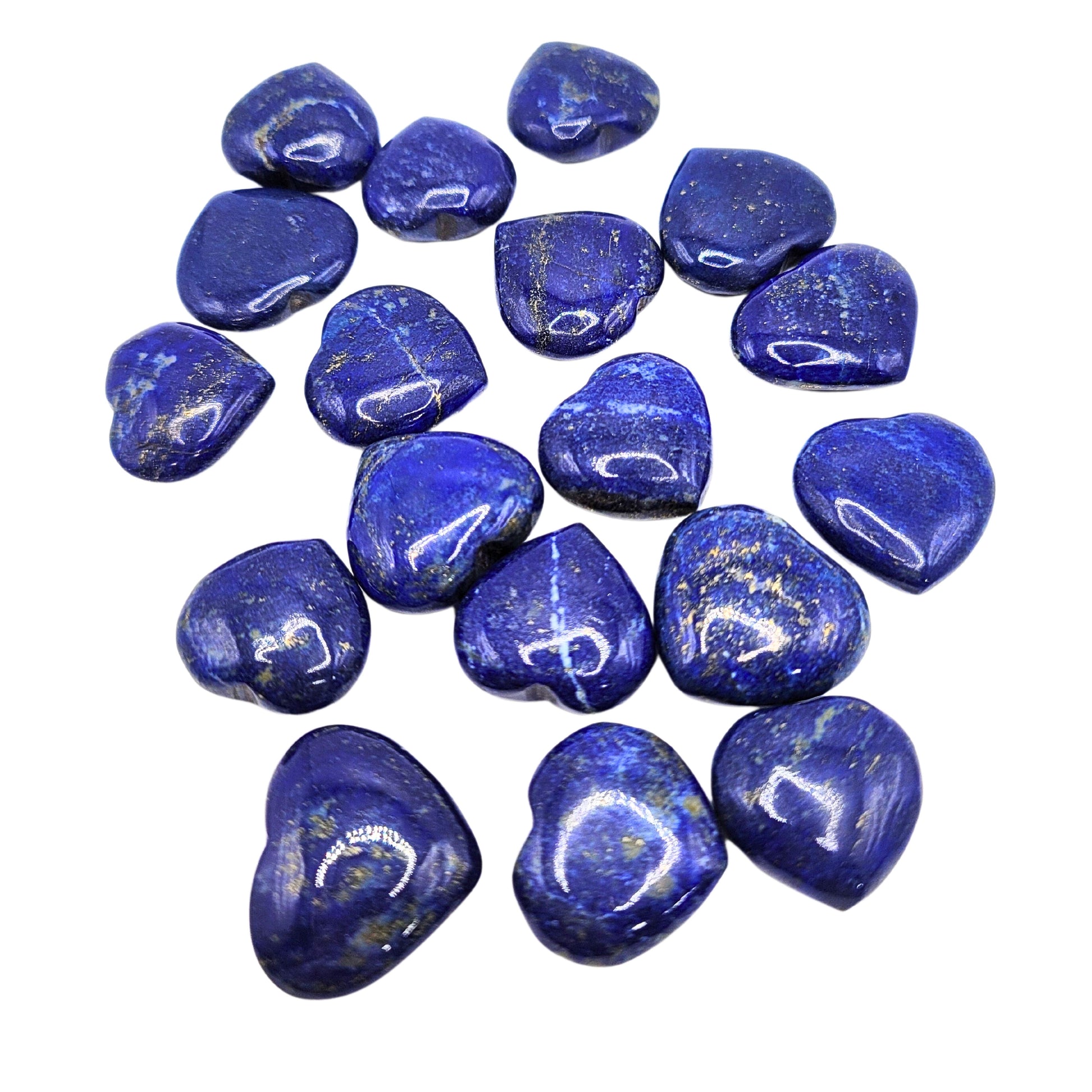 Lapis Lazuli Hearts from Afghanistan. High-grade loyal blue Lapis with natural polish. Lapis Lazuli has the mineral composition of Lazurite (blue), Calcite (white), and gold (pyrite). You will receive an intuitively chosen heart from the lot in the picture.