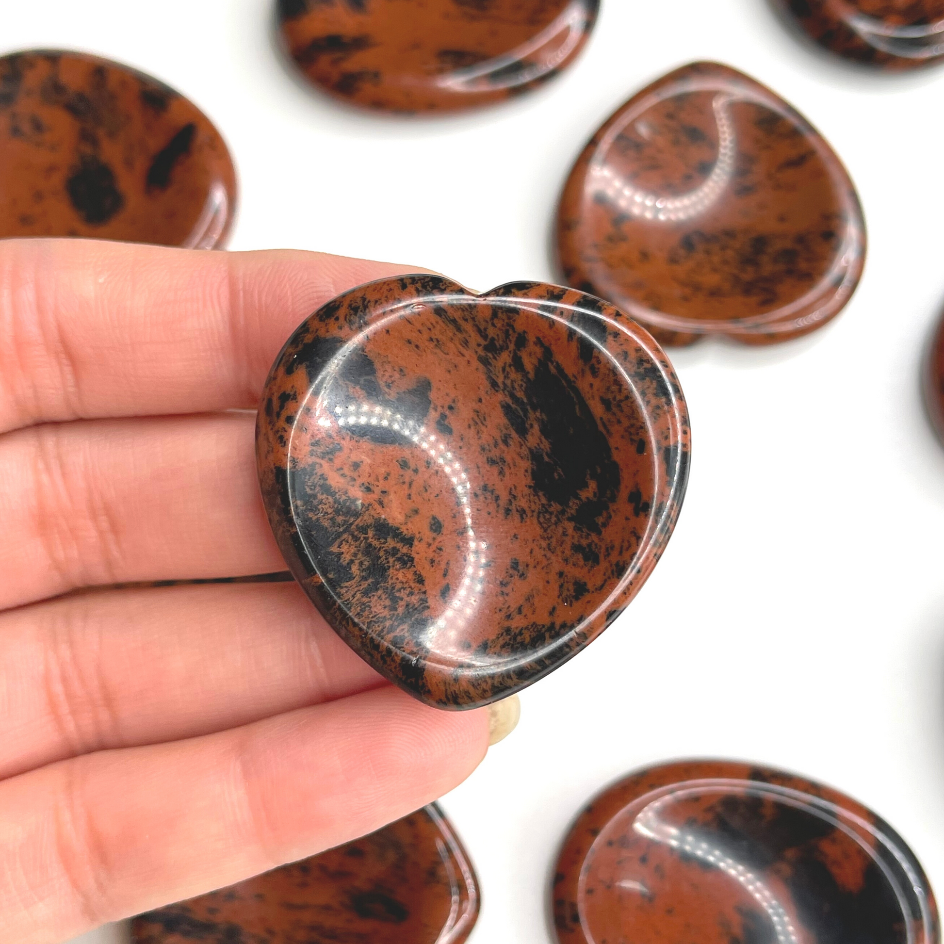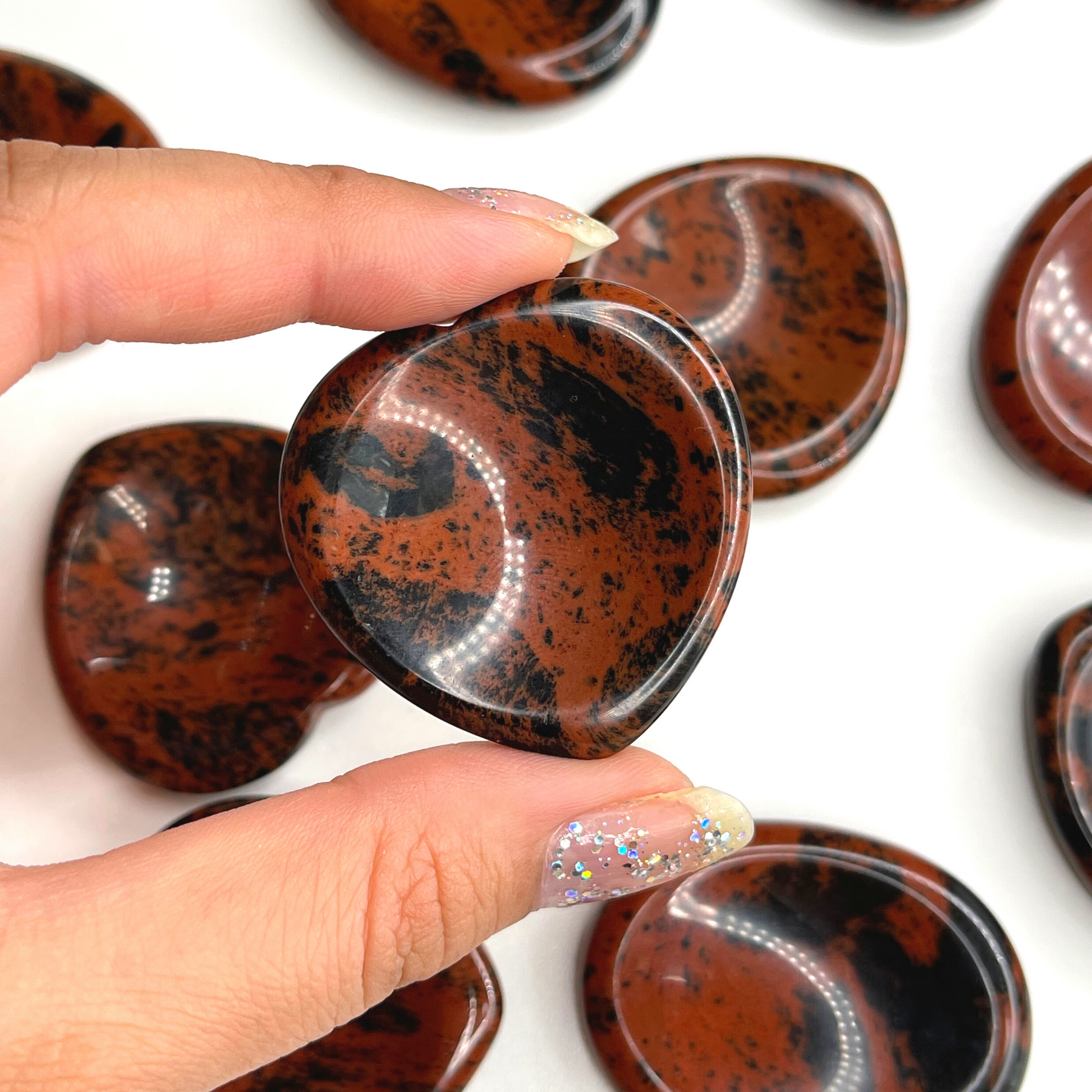 Mohagany Obsidian worry stone (also know as thumb stone), is used to relieve anxiety and stress. This is a stone used by monks to distract mind from any stress and meditate. You rub the worry stone with your thumb, fingers or in your palms and can stimulate different nerve endings that promote calmness, release endorphins, and have an overall euphoric effect.