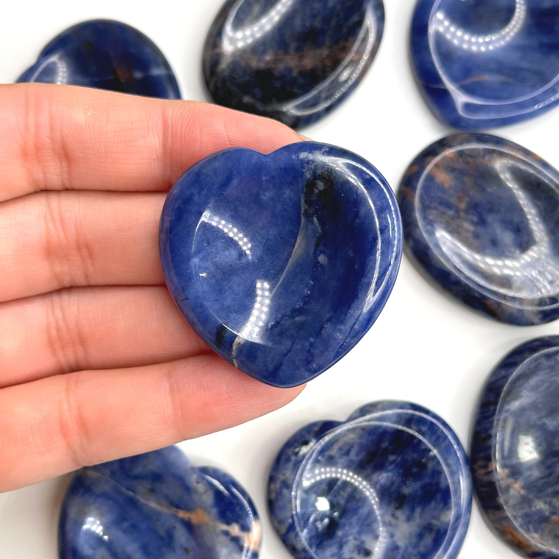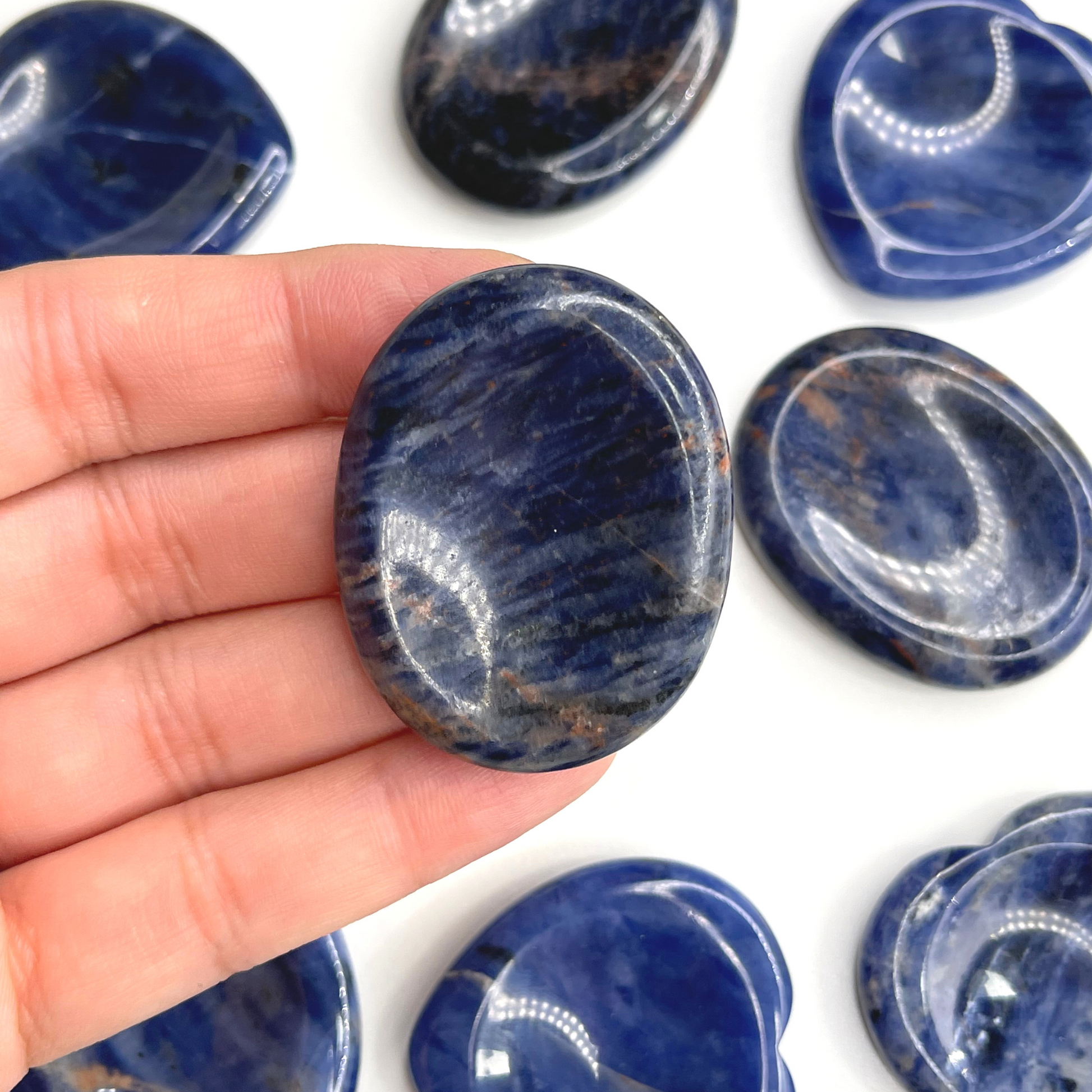 Sodalite worry stone (also know as thumb stone), is used to relieve anxiety and stress. This is a stone used by monks to distract mind from any stress and meditate. You rub the worry stone with your thumb, fingers or in your palms and can stimulate different nerve endings that promote calmness, release endorphins, and have an overall euphoric effect.