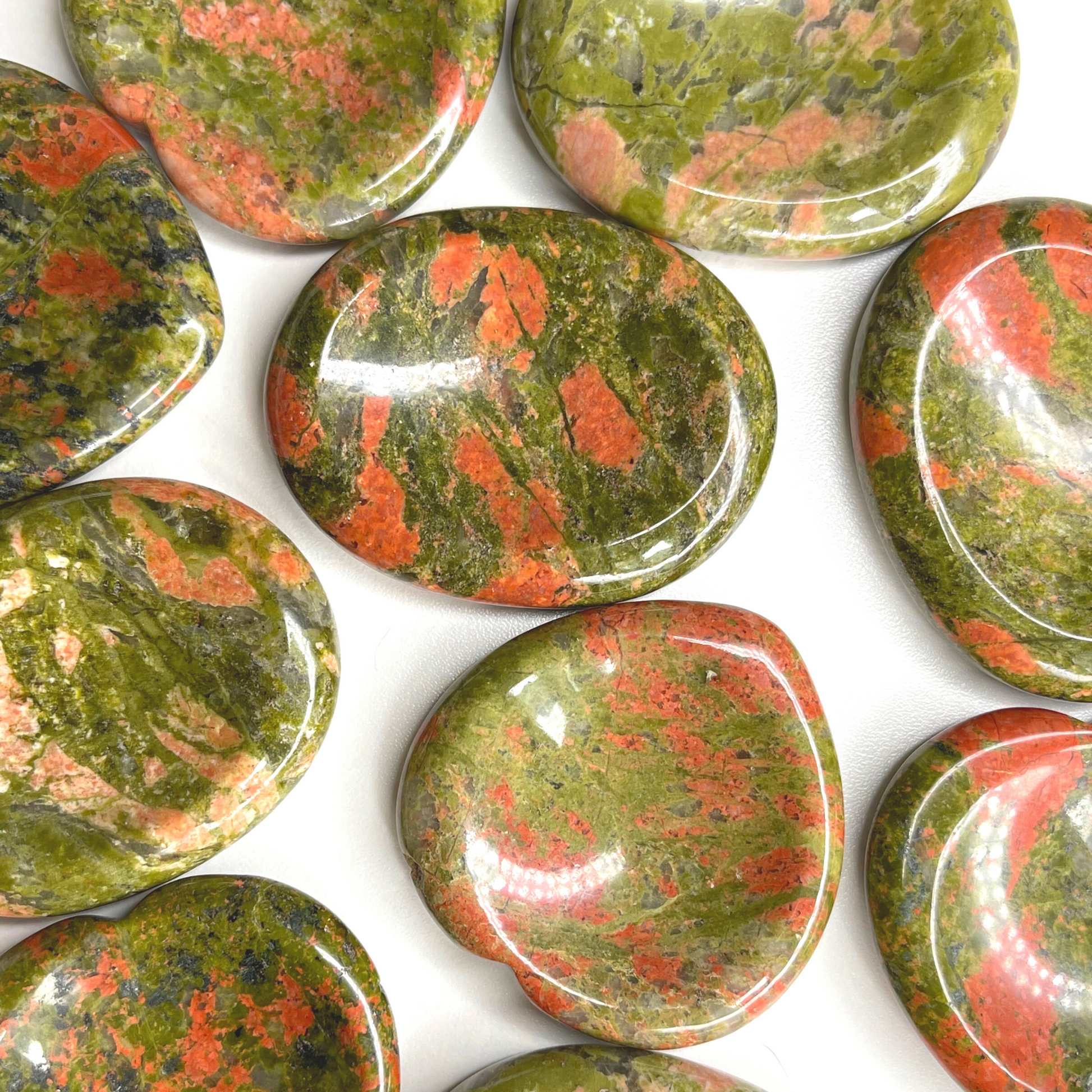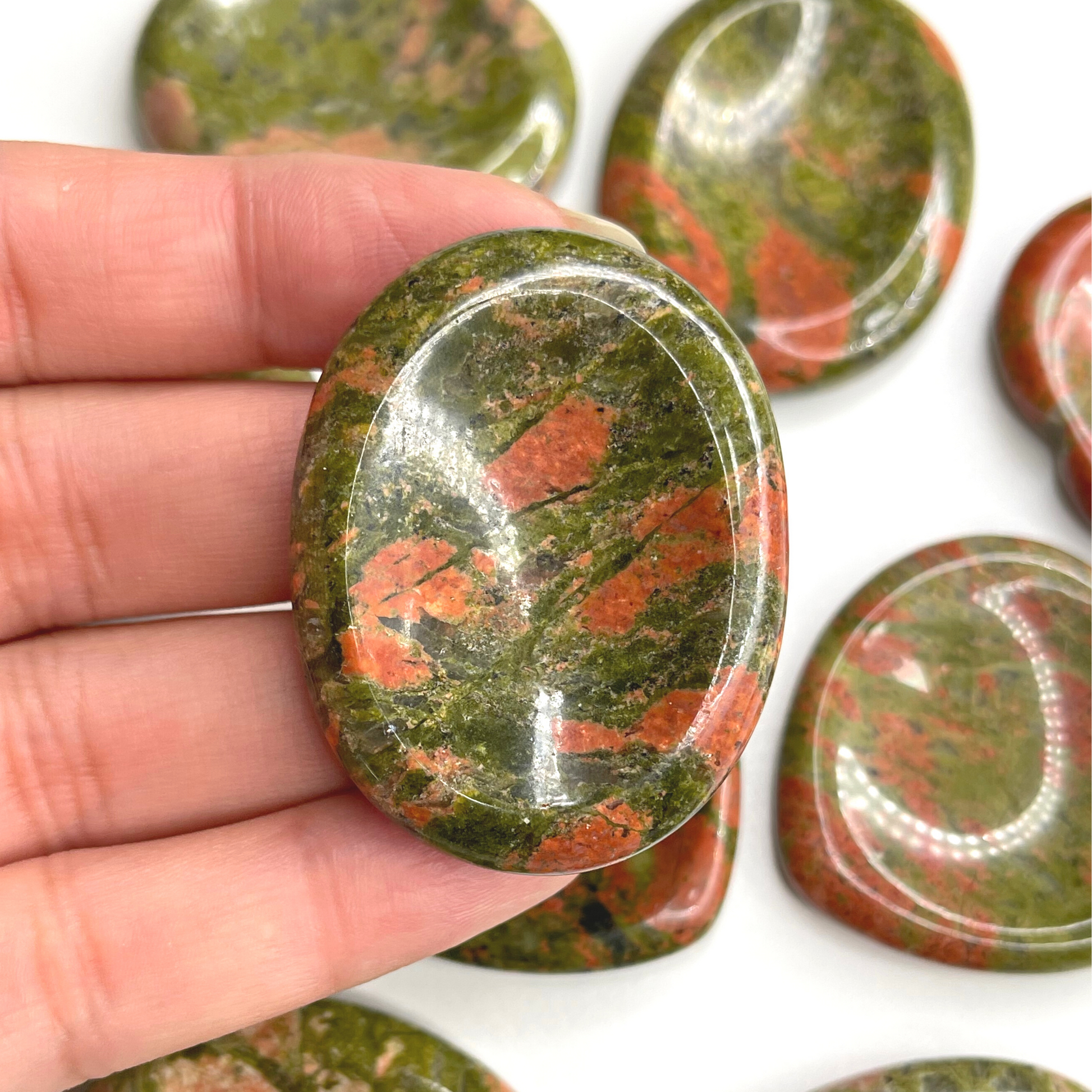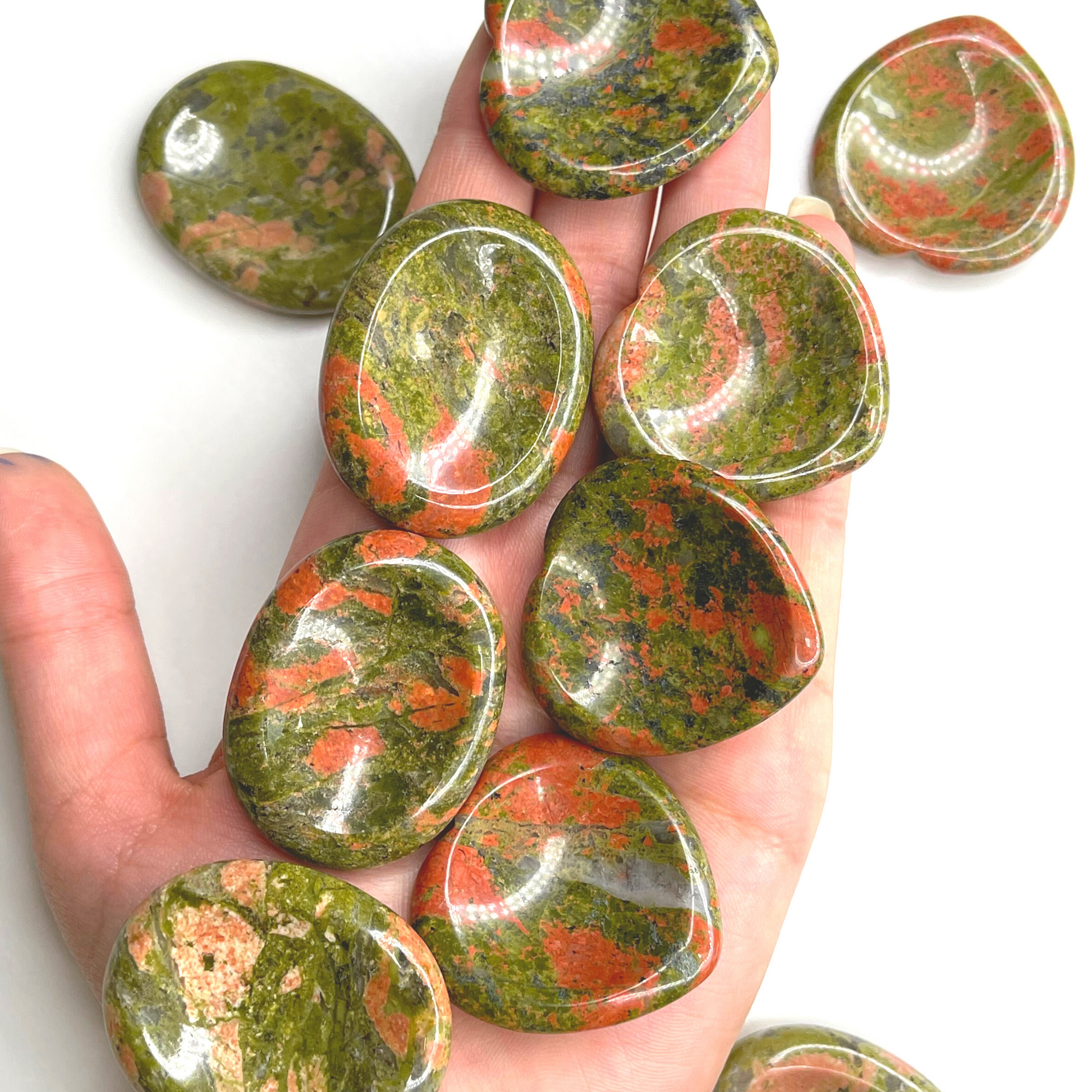 Unakite worry stone (also know as thumb stone), is used to relieve anxiety and stress. This is a stone used by monks to distract mind from any stress and meditate. You rub the worry stone with your thumb, fingers or in your palms and can stimulate different nerve endings that promote calmness, release endorphins, and have an overall euphoric effect.